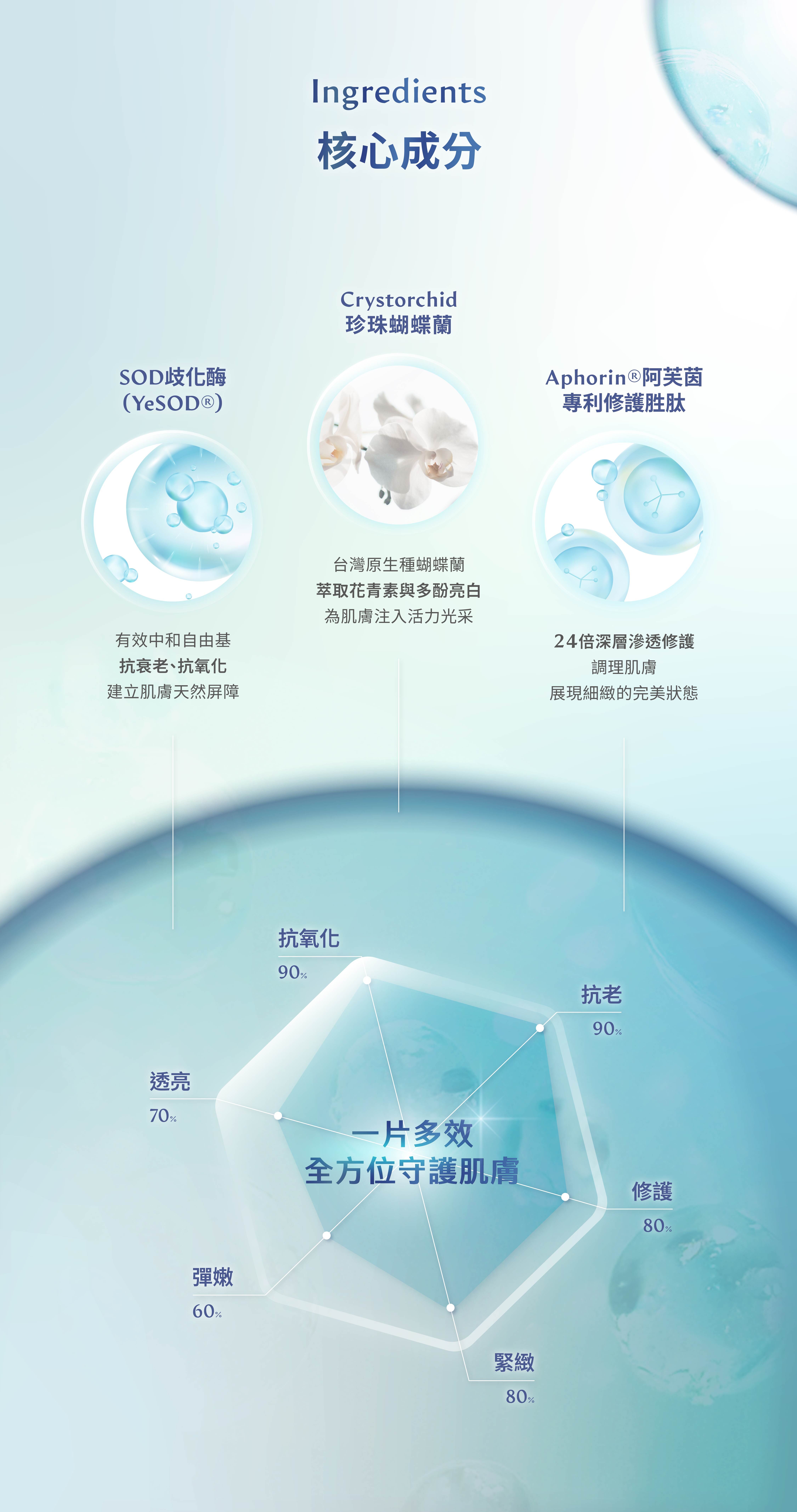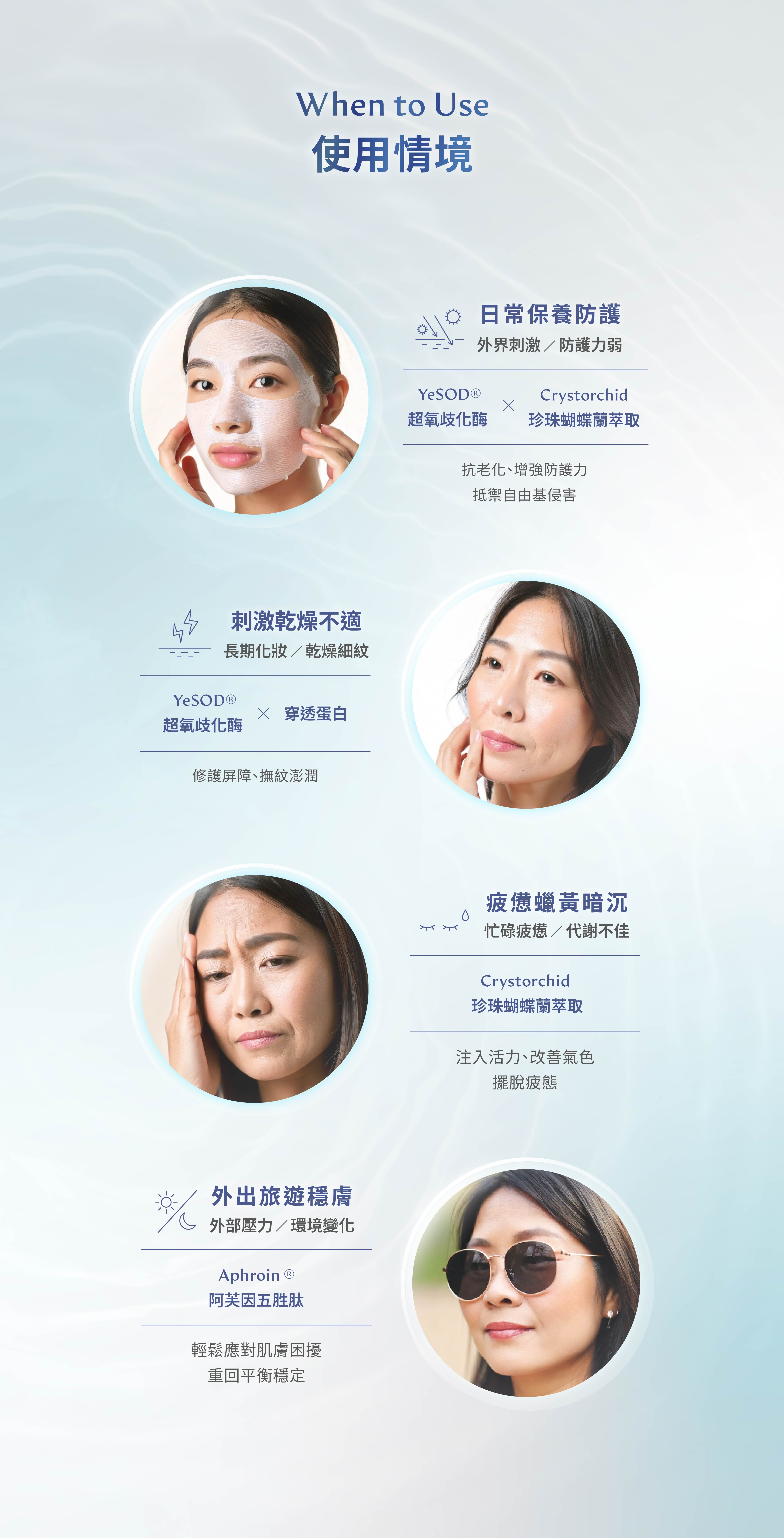 專為老化肌齡強化防護力 精準調理肌膚缺水、暗沉、斑點、動態紋路、肌膚粗糙狀態,全面提升肌膚穩定度
