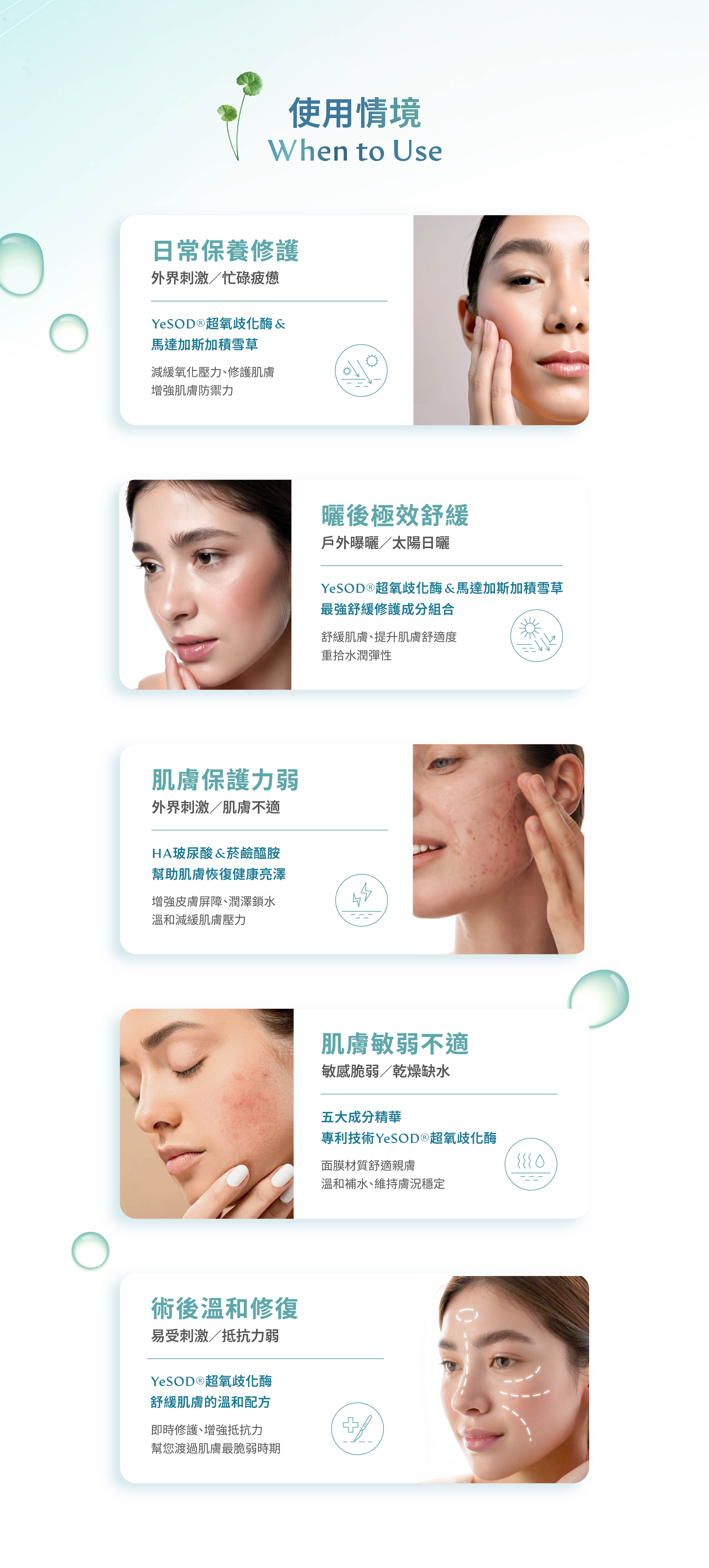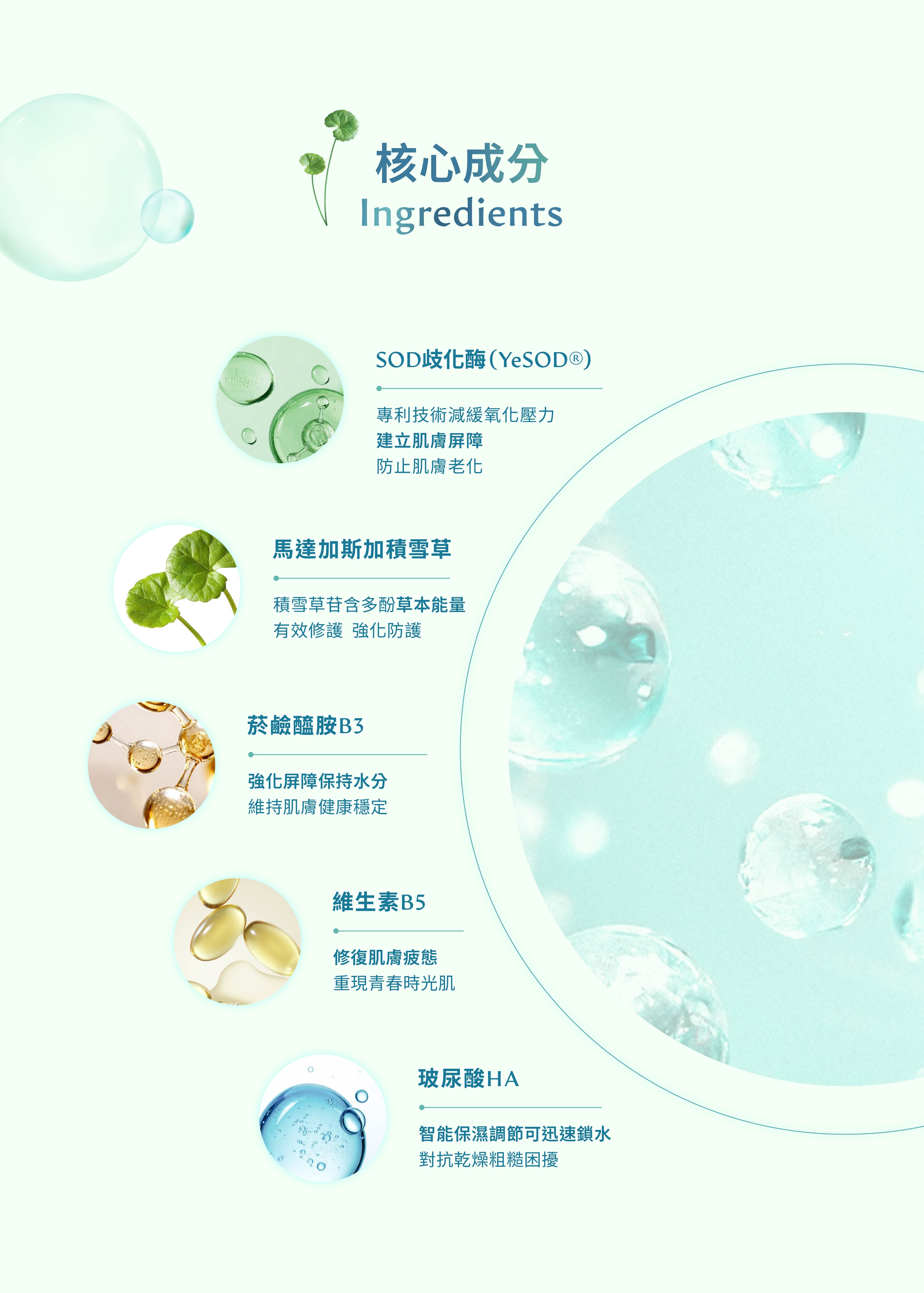 +科技與天然植萃的最強修護組合:業界領先抗老專利技術YeSOD® x 馬達加斯加CICA積雪草精萃能量,有效修護受損肌膚,舒緩不適,重現肌膚活力