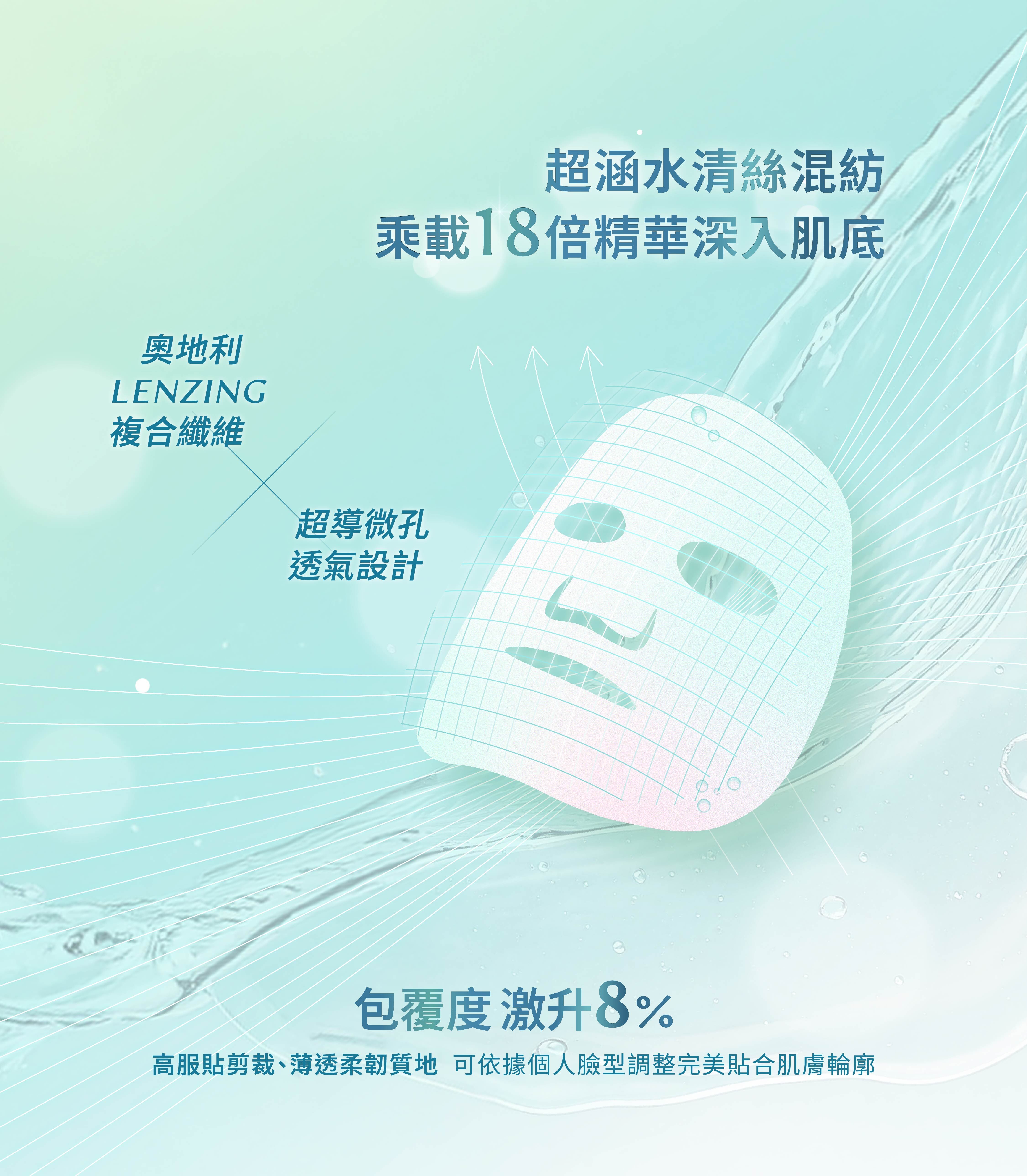 超涵水清絲混紡 18倍高乘載高純度精華,從肌膚底層補水與肌膚表層鎖水的雙重修護與防護,推薦醫美術後與肌膚不穩時的修護需求,溫和保濕舒緩不適